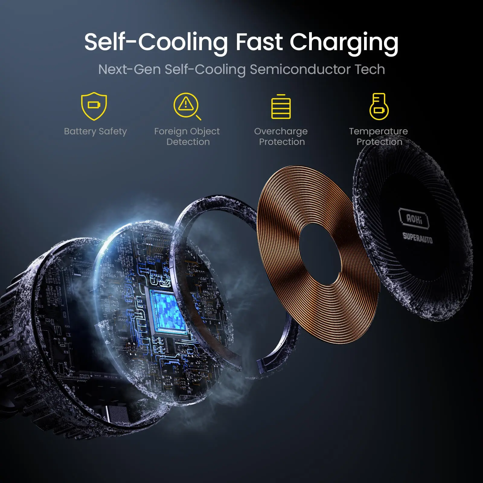 AOHI SUPERAUTO Self-Cooling Magnetic Wireless Car Charger with 3.3FT C-C Cable